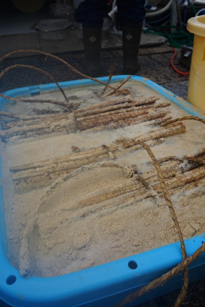 2️⃣荒縄で縛りアク抜きの為 粉糠の桶に